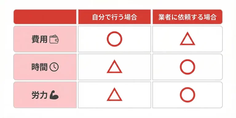 まずは見積もりを取って費用感を把握し、自分で対応する部分と業者に任せる部分を整理することから始めてみてはいかがでしょうか。